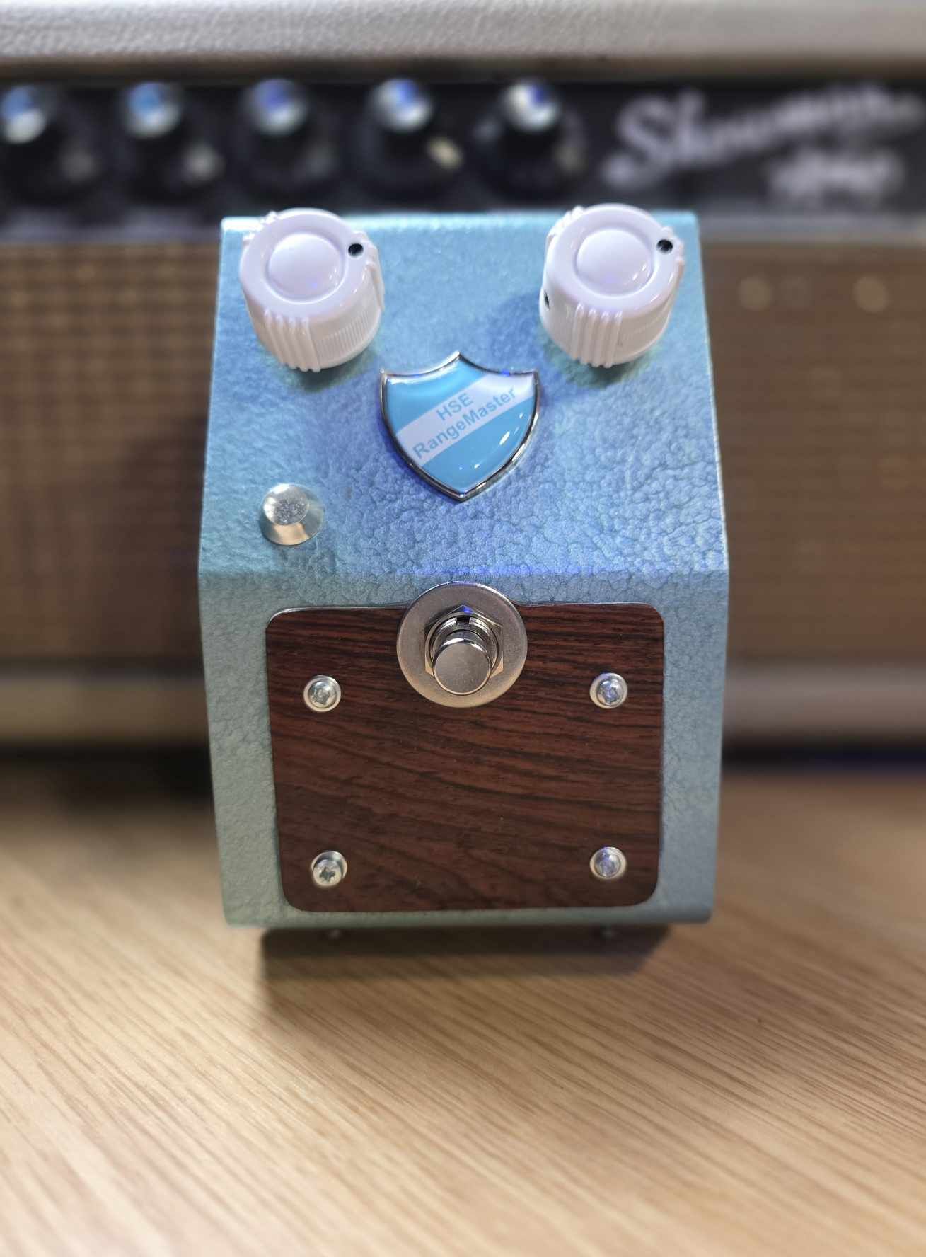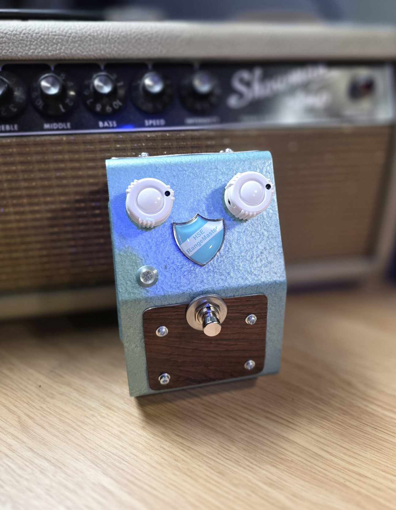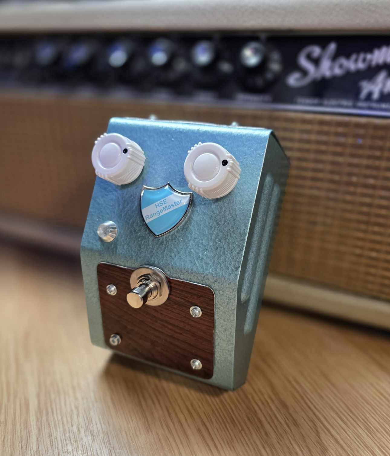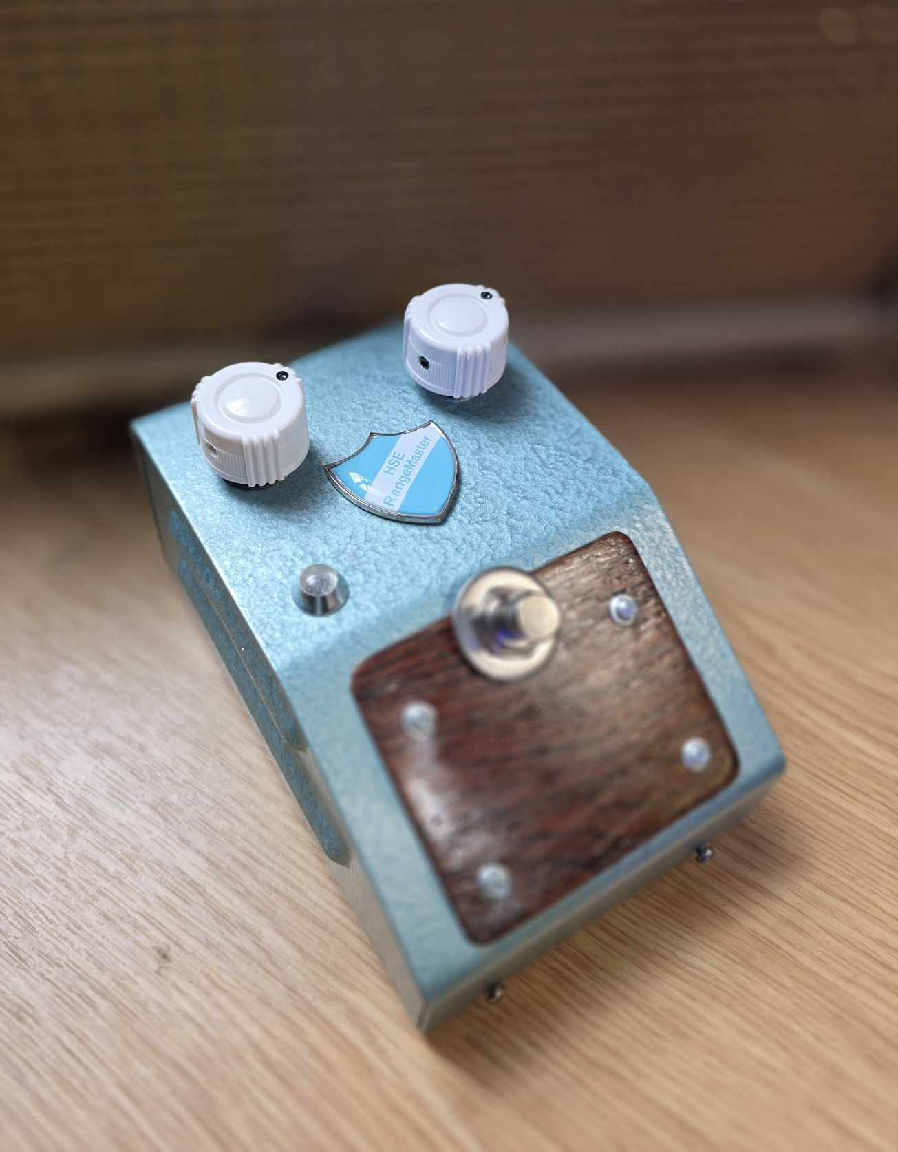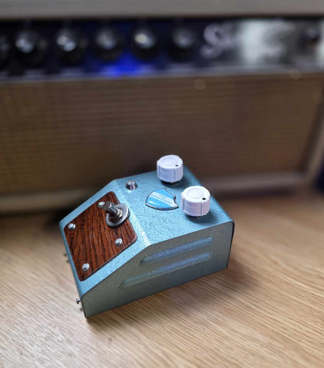This Rangemaster treble booster is built inside a vintage enclosure fitted with real Brazilian rosewood veneer plates.