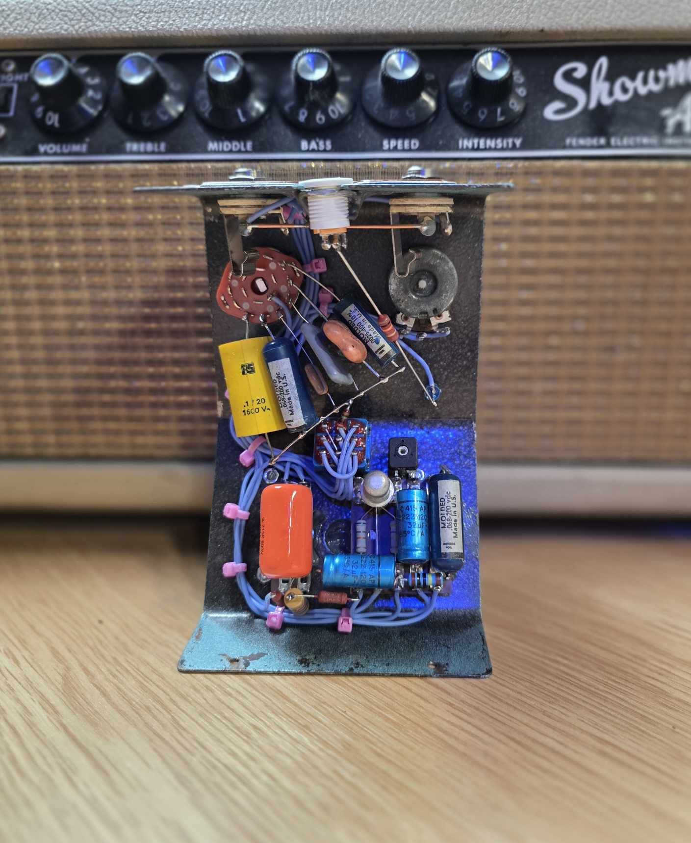 The signal path uses blue moulded capacitors of the type commonly found in 1960s blackface Fender and Magnatone amplifiers. These parts are known for their stability and smooth high frequency behaviour.
